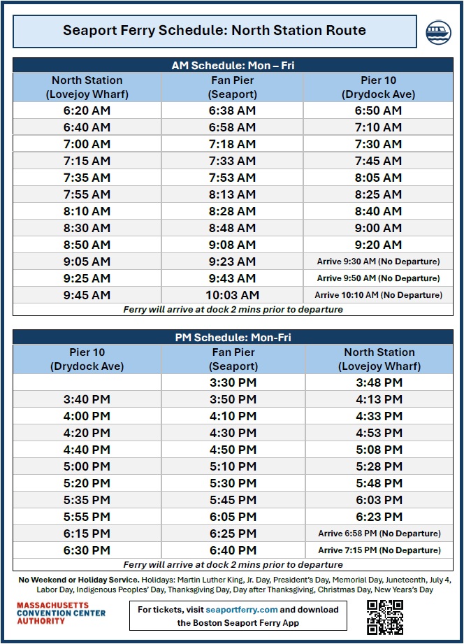The Seaport Ferry will not run on Wednesday, Dec. 24th, 2025 or Thursday, Dec. 25th, 2025. Normal operations will resume Friday, Dec. 26th, 2025.